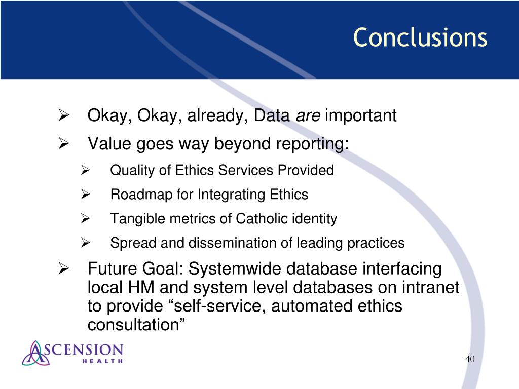 Conclusions • Okay, Okay, already, Data are important • Value goes way beyond reporting: • Quality of Ethics Services Provided • Roadmap for Integrating Ethics • Tangible metrics of Catholic identity • Spread and dissemination of leading practices • Future Goal: Systemwide database interfacing local HM and system level databases on intranet to provide “self-service, automated ethics consultation”