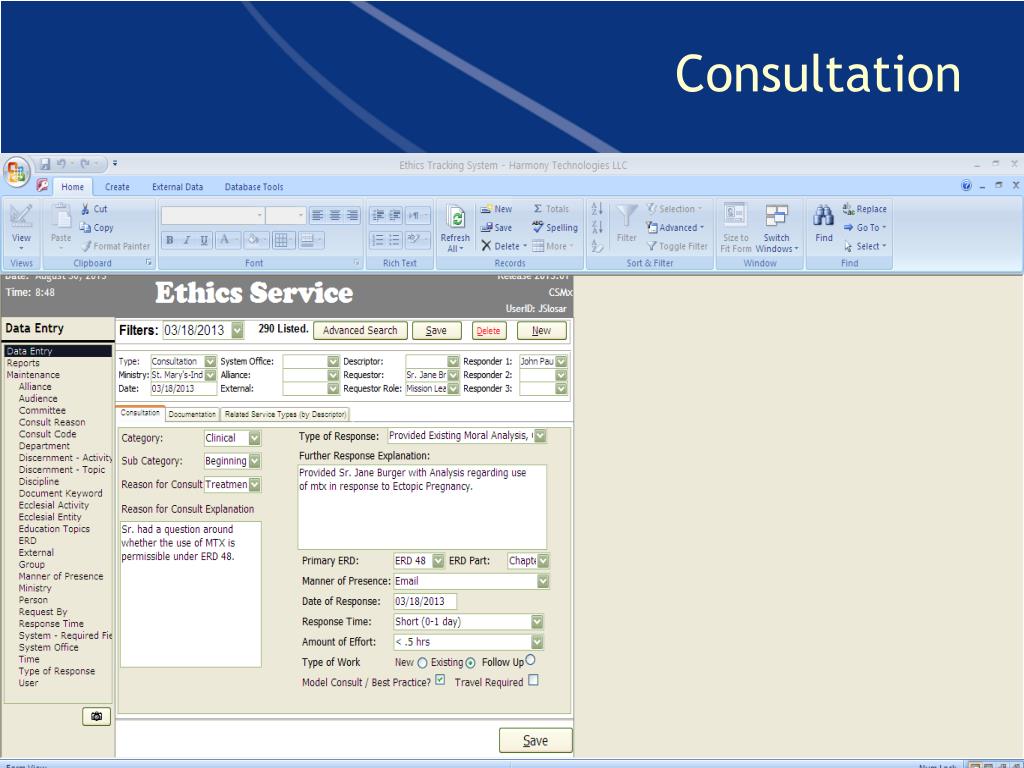 Context for Ethics Consultation • Columbia St. Mary’s Health System • Three Acute Care Hospitals ~722 beds • 64 physician clinics with ~400+ employed physicians; 1100 affiliated physicians • FY 2011: 22.970 hospital discharges; 72,344 ED visits; 24,459 OP Hospital Visits • Ethics Consultation Service: • Two Medical Staff Ethics Committees • One PhD Ethicist; Ad Hoc Consultation Model/Advisement Model • Ethics Consultation for Database: • 523 consults from January 2003 through December 2011 • Cases: • Identified ethical reason for consultation • Identified discipline requesting • CSM Ethics consultation service engaged • Ethics consultation documented • Ethics recommendations made to case