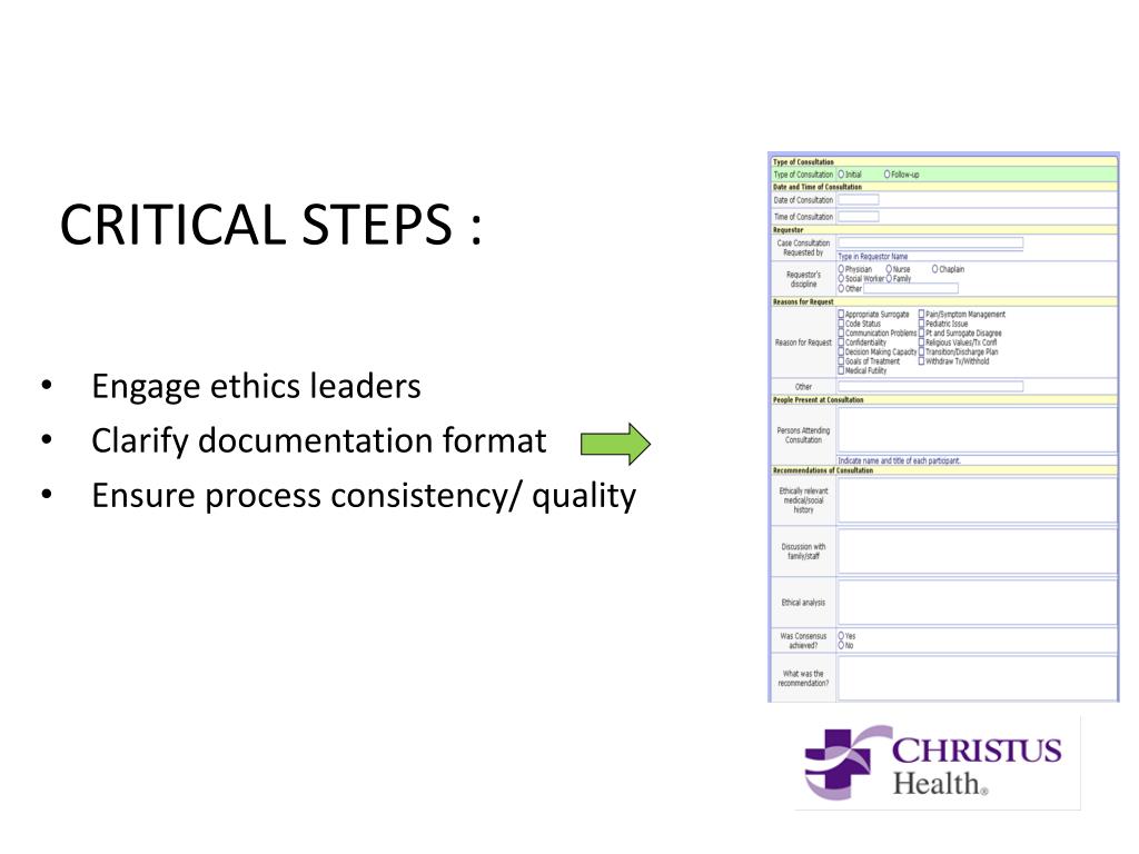 CRITICAL STEPS : • Engage ethics leaders • Clarify documentation format • Ensure process consistency/ quality