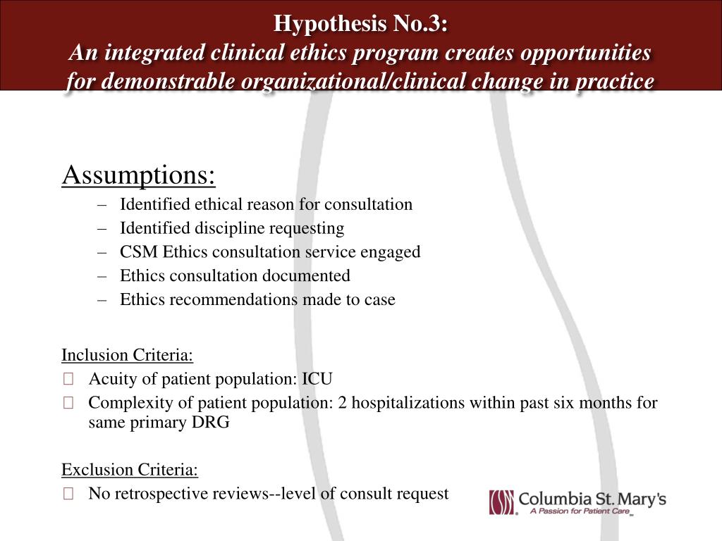 Hypothesis No.3: An integrated clinical ethics program creates opportunities for demonstrable organizational/clinical change in practice Assumptions: • Identified ethical reason for consultation • Identified discipline requesting • CSM Ethics consultation service engaged • Ethics consultation documented • Ethics recommendations made to case Inclusion Criteria: • Acuity of patient population: ICU • Complexity of patient population: 2 hospitalizations within past six months for same primary DRG Exclusion Criteria: • No retrospective reviews--level of consult request