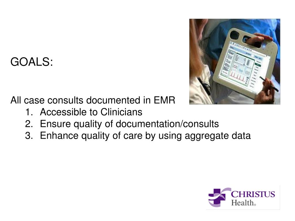 GOALS: • All case consults documented in EMR • Accessible to Clinicians • Ensure quality of documentation/consults • Enhance quality of care by using aggregate data