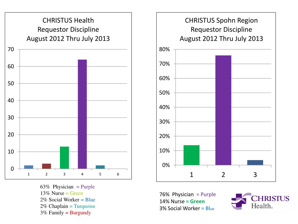 63% Physician = Purple 13% Nurse = Green 2% Social Worker = Blue 2% Chaplain = Turquoise 3% Family = Burgundy 76% Physician = Purple 14% Nurse = Green 3% Social Worker = Blue