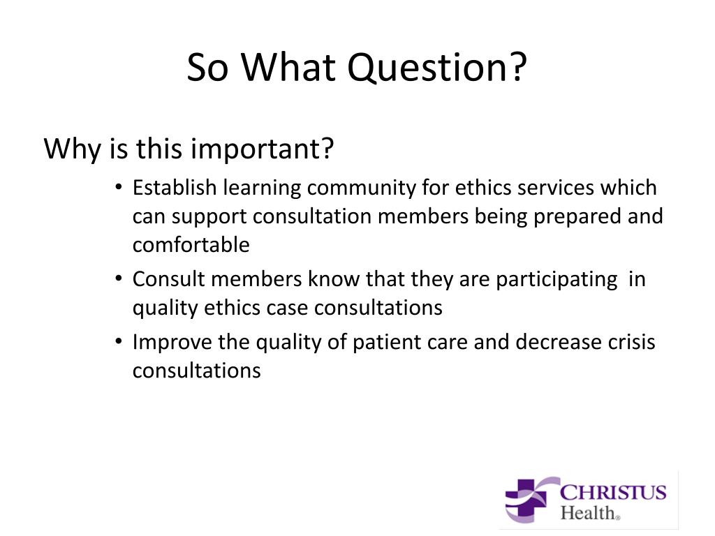 So What Question? Why is this important? • Establish learning community for ethics services which can support consultation members being prepared and comfortable • Consult members know that they are participating in quality ethics case consultations • Improve the quality of patient care and decrease crisis consultations