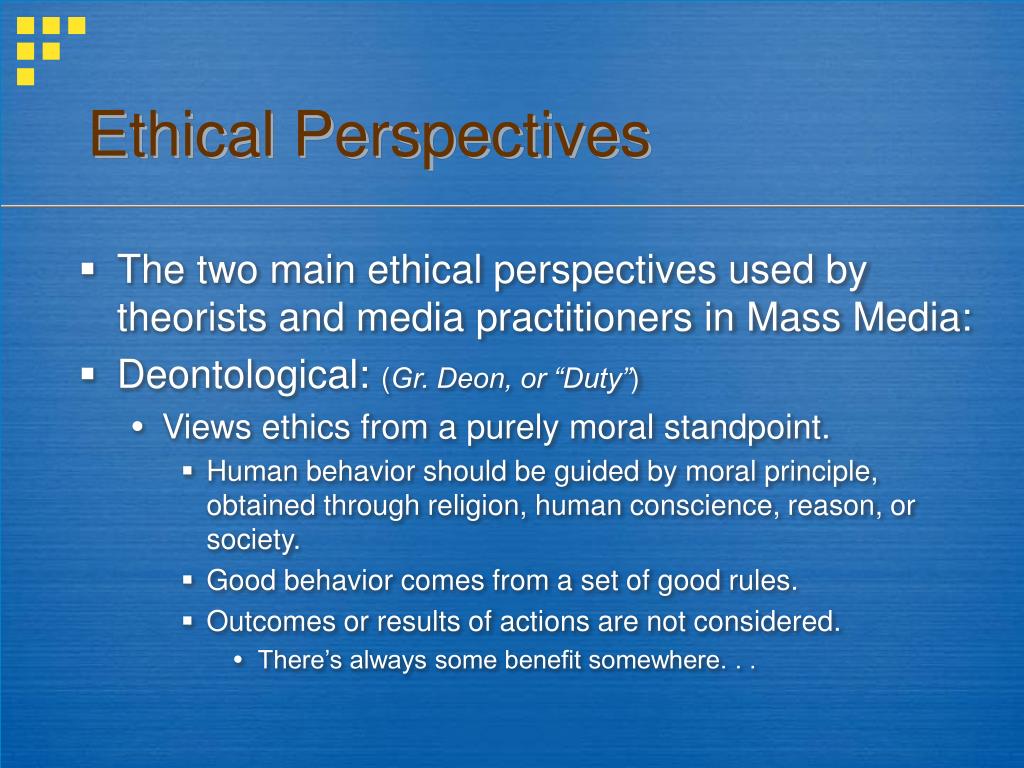 Ethical Perspectives • The two main ethical perspectives used by theorists and media practitioners in Mass Media: • Deontological: (Gr. Deon, or “Duty”) • Views ethics from a purely moral standpoint. • Human behavior should be guided by moral principle, obtained through religion, human conscience, reason, or society. • Good behavior comes from a set of good rules. • Outcomes or results of actions are not considered. • There’s always some benefit somewhere. . .