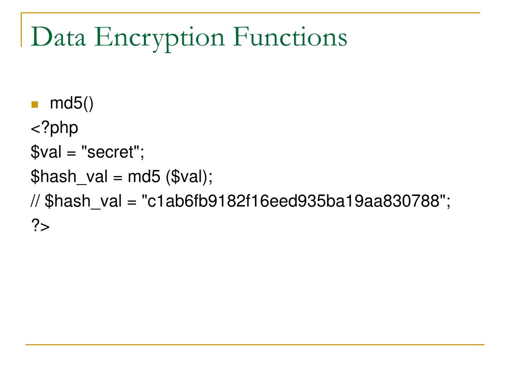Data Encryption Functions • md5() <?php $val = "secret"; $hash_val = md5 ($val); // $hash_val = "c1ab6fb9182f16eed935ba19aa830788"; ?>