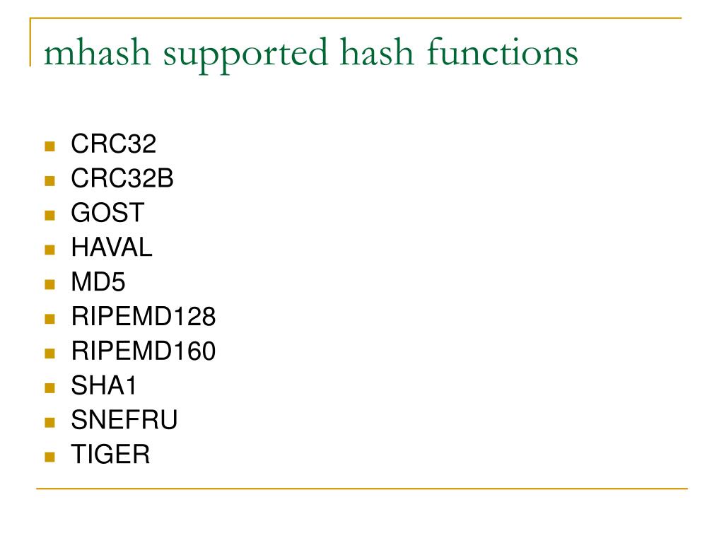 mhash supported hash functions • CRC32 • CRC32B • GOST • HAVAL • MD5 • RIPEMD128 • RIPEMD160 • SHA1 • SNEFRU • TIGER