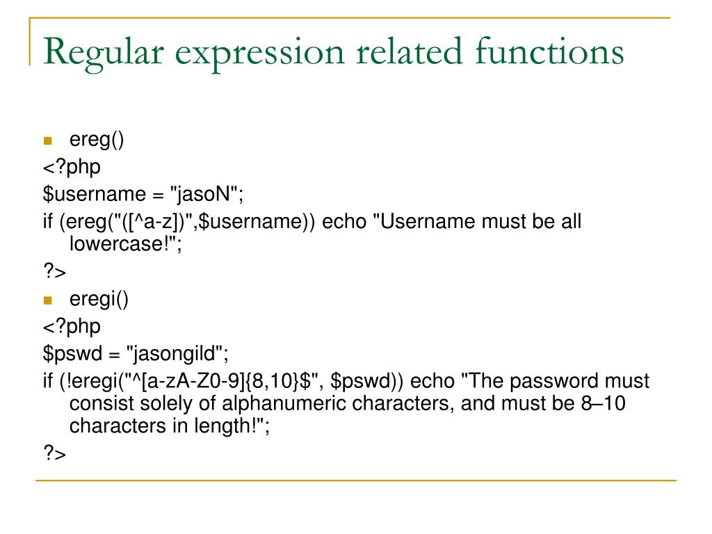 Regular expression related functions • ereg() <?php $username = "jasoN"; if (ereg("([^a-z])",$username)) echo "Username must be all lowercase!"; ?> • eregi() <?php $pswd = "jasongild"; if (!eregi("^[a-zA-Z0-9]{8,10}$", $pswd)) echo "The password must consist solely of alphanumeric characters, and must be 8–10 characters in length!"; ?>
