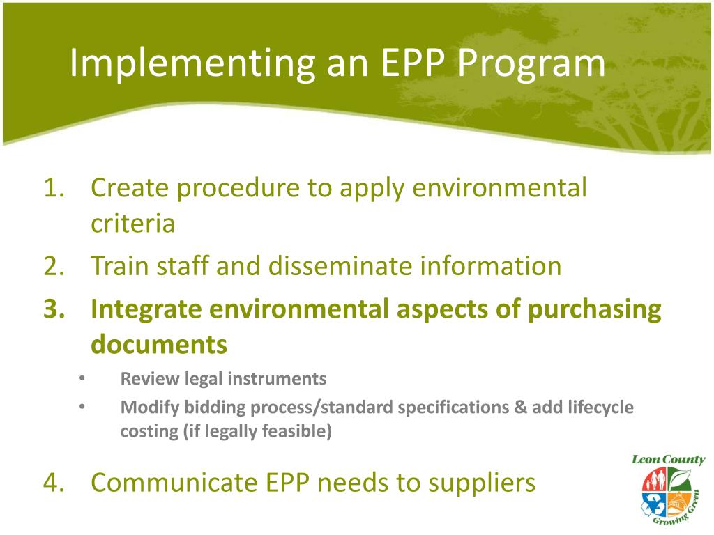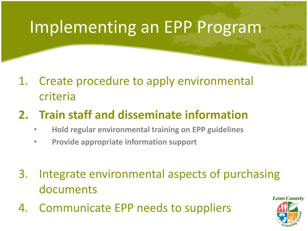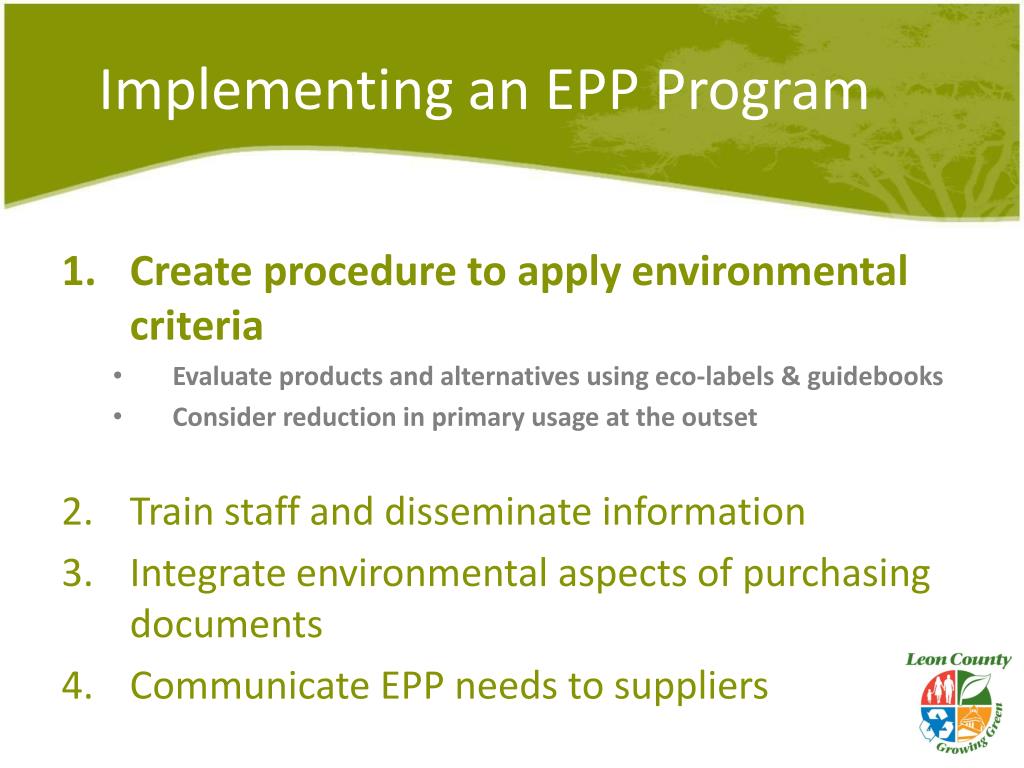 Implementing an EPP Program Create procedure to apply environmental criteria Train staff and disseminate information Integrate environmental aspects of purchasing documents Communicate EPP needs to suppliers