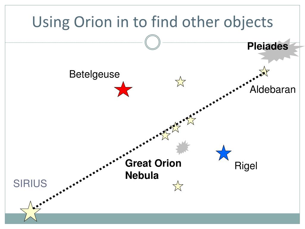 Pleiades Great Orion Nebula Using Orion in to find other objects Betelgeuse Aldebaran Rigel SIRIUS