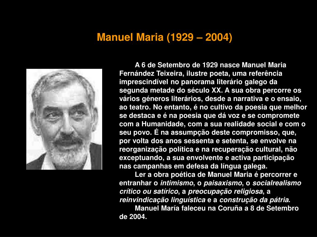 Manuel Maria (1929 – 2004) A 6 de Setembro de 1929 nasce Manuel Maria Fernández Teixeira, ilustre poeta, uma referência imprescindível no panorama literário galego da segunda metade do século XX. A sua obra percorre os vários géneros literários, desde a narrativa e o ensaio, ao teatro. No entanto, é no cultivo da poesia que melhor se destaca e é na poesia que dá voz e se compromete com a Humanidade, com a sua realidade social e com o seu povo. É na assumpção deste compromisso, que, por volta dos anos sessenta e setenta, se envolve na reorganização política e na recuperação cultural, não exceptuando, a sua envolvente e activa participação nas campanhas em defesa da língua galega. Ler a obra poética de Manuel Maria é percorrer e entranhar o intimismo, o paisaxismo, o socialrealismocrítico ou satírico, a preocupação religiosa, a reinvindicação linguística e a construção da pátria. Manuel María faleceu na Coruña a 8 de Setembro de 2004.
