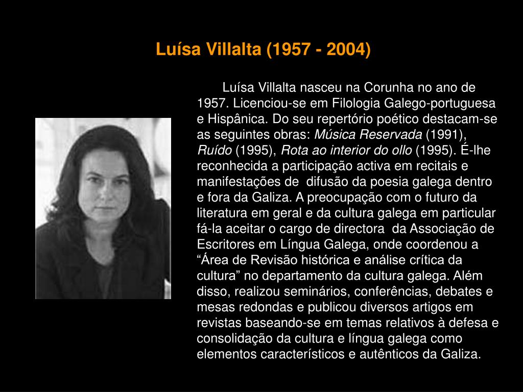 Luísa Villalta(1957 - 2004) Luísa Villalta nasceu na Corunha no ano de 1957. Licenciou-se em Filologia Galego-portuguesa e Hispânica. Do seu repertório poético destacam-se as seguintes obras: Música Reservada (1991), Ruído (1995), Rota ao interior do ollo (1995). É-lhe reconhecida a participação activa em recitais e manifestações de difusão da poesia galega dentro e fora da Galiza. A preocupação com o futuro da literatura em geral e da cultura galega em particular fá-la aceitar o cargo de directora da Associação de Escritores em Língua Galega, onde coordenou a “Área de Revisão histórica e análise crítica da cultura” no departamento da cultura galega. Além disso, realizou seminários, conferências, debates e mesas redondas e publicou diversos artigos em revistas baseando-se em temas relativos à defesa e consolidação da cultura e língua galega como elementos característicos e autênticos da Galiza.