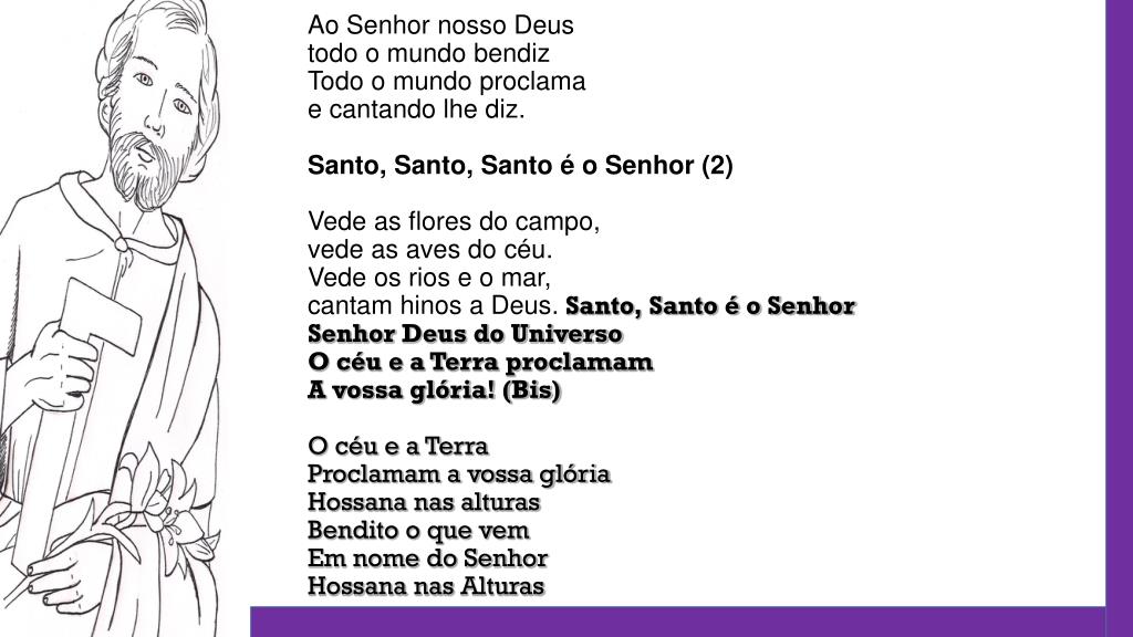 Ao Senhor nosso Deus todo o mundo bendizTodo o mundo proclama e cantando lhe diz.Santo, Santo, Santo é o Senhor (2)Vede as flores do campo, vede as aves do céu.Vede os rios e o mar, cantam hinos a Deus. Santo, Santo é o SenhorSenhor Deus do UniversoO céu e a Terra proclamamA vossa glória! (Bis)O céu e a Terra Proclamam a vossa glóriaHossana nas alturasBendito o que vem Em nome do SenhorHossana nas Alturas