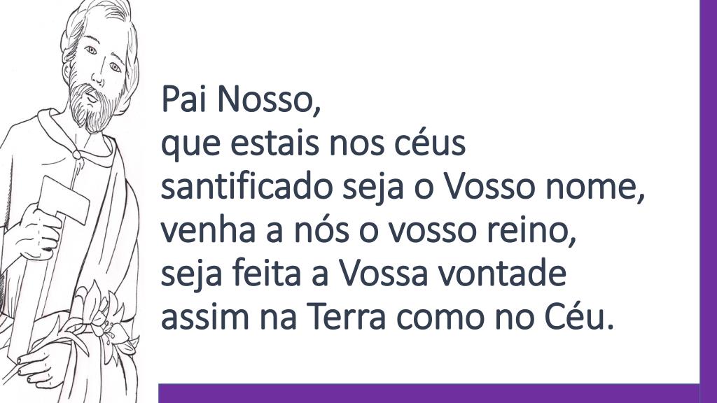 Pai Nosso,que estais nos céussantificado seja o Vosso nome,venha a nós o vosso reino,seja feita a Vossa vontadeassim na Terra como no Céu.