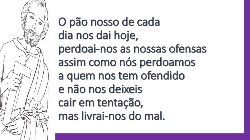 O pão nosso de cada dia nos dai hoje,perdoai-nos as nossas ofensasassim como nós perdoamosa quem nos tem ofendidoe não nos deixeis cair em tentação,mas livrai-nos do mal.