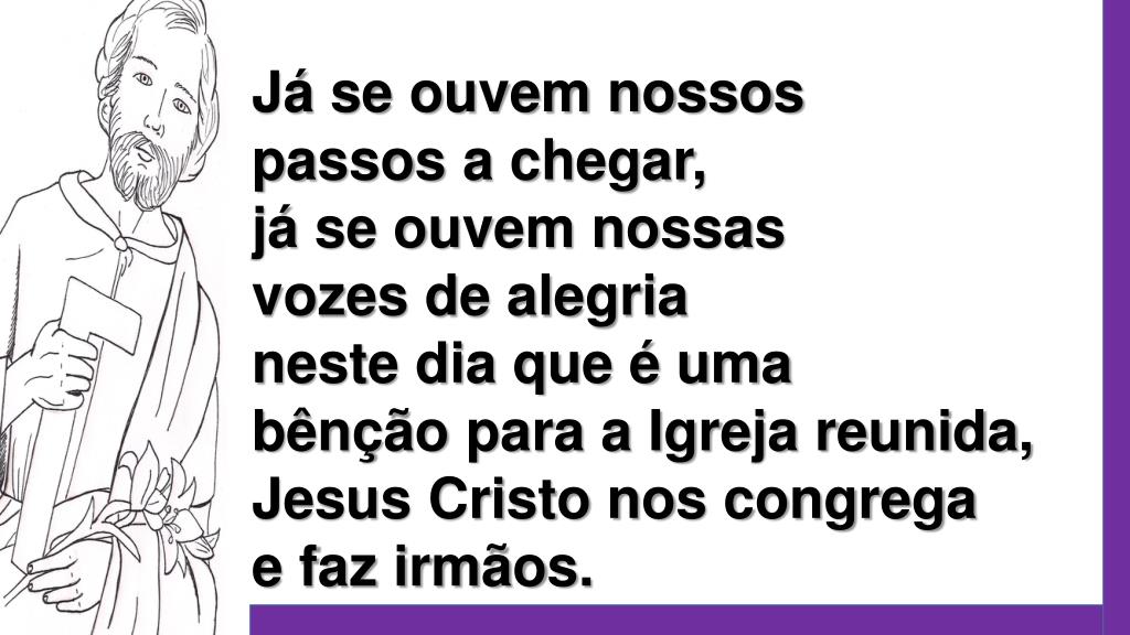Já se ouvem nossos passos a chegar,já se ouvem nossas vozes de alegrianeste dia que é uma bênção para a Igreja reunida,Jesus Cristo nos congrega e faz irmãos.