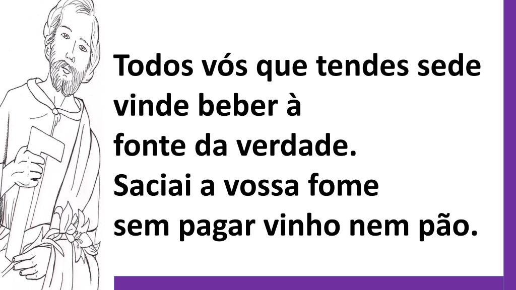 Todos vós que tendes sedevinde beber à fonte da verdade.Saciai a vossa fomesem pagar vinho nem pão.
