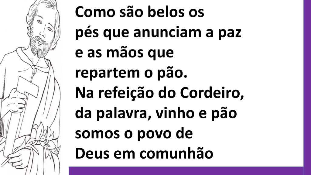 Como são belos os pés que anunciam a paze as mãos que repartem o pão.Na refeição do Cordeiro, da palavra, vinho e pãosomos o povo de Deus em comunhão