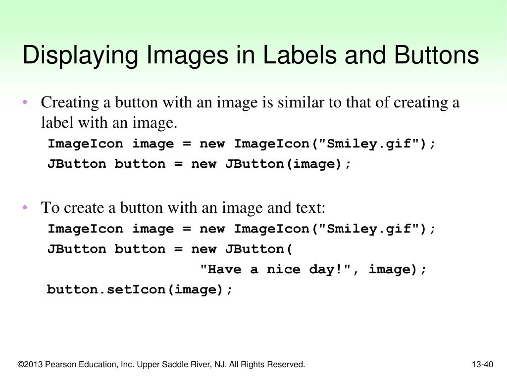 Displaying Images in Labels and Buttons Labels can display text, an image, or both. To display an image, create an instance of the ImageIcon class, which reads the image file. The constructor accepts the name of an image file. The supported file types are JPEG, GIF, and PNG. The name can also contain path information. ImageIcon image = new ImageIcon("Smiley.gif"); or ImageIcon image = new ImageIcon( "C:\\Chapter 12\\Images\\Smiley.gif");