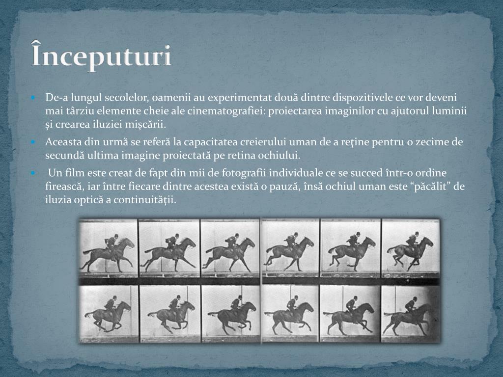 Începuturi • De-a lungul secolelor, oamenii au experimentat două dintre dispozitivele ce vor deveni mai târziu elemente cheie ale cinematografiei: proiectarea imaginilor cu ajutorul luminii şi crearea iluziei mişcării. • Aceasta din urmă se referă la capacitatea creierului uman de a reţine pentru o zecime de secundă ultima imagine proiectată pe retina ochiului. • Un film este creat de fapt din mii de fotografii individuale ce se succed într-o ordine firească, iar între fiecare dintre acestea există o pauză, însă ochiul uman este “păcălit” de iluzia optică a continuităţii.