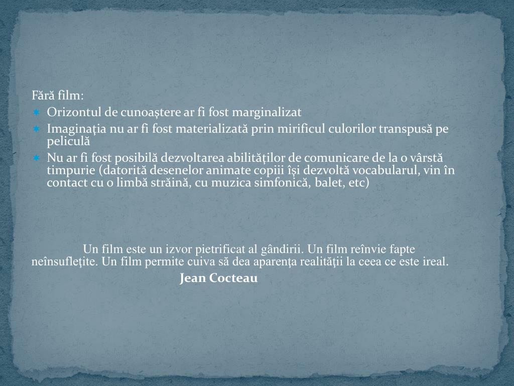 Fără film: • Orizontul de cunoaştere ar fi fost marginalizat • Imaginaţia nu ar fi fost materializată prin mirificul culorilor transpusă pe peliculă • Nu ar fi fost posibilă dezvoltarea abilităţilor de comunicare de la o vârstă timpurie (datorită desenelor animate copiii îşi dezvoltă vocabularul, vin în contact cu o limbă străină, cu muzica simfonică, balet, etc) Un film este un izvor pietrificat al gândirii. Un film reînvie fapte neînsufleţite. Un film permite cuiva să dea aparenţa realităţii la ceea ce este ireal. Jean Cocteau