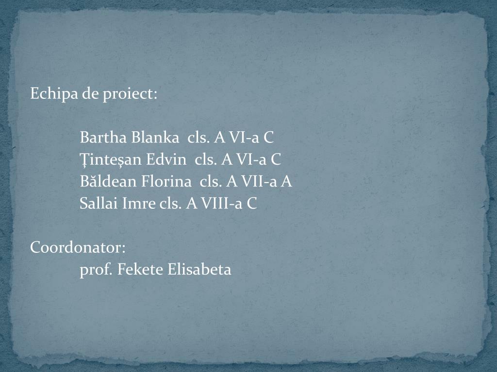 Echipa de proiect: Bartha Blanka cls. A VI-a C Ţinteşan Edvin cls. A VI-a C Băldean Florina cls. A VII-a A Sallai Imre cls. A VIII-a C Coordonator: prof. Fekete Elisabeta