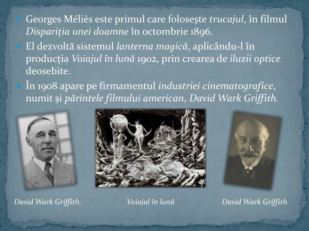 Georges Méliès este primul care foloseşte trucajul, în filmul Dispariția unei doamne în octombrie 1896. • El dezvoltă sistemul lanterna magică, aplicându-l în producția Voiajul în lună 1902, prin crearea de iluzii optice deosebite. • În 1908 apare pe firmamentul industriei cinematografice, numit și părintele filmului american, David WarkGriffith. David Wark Griffith. Voiajul în lună David Wark Griffith