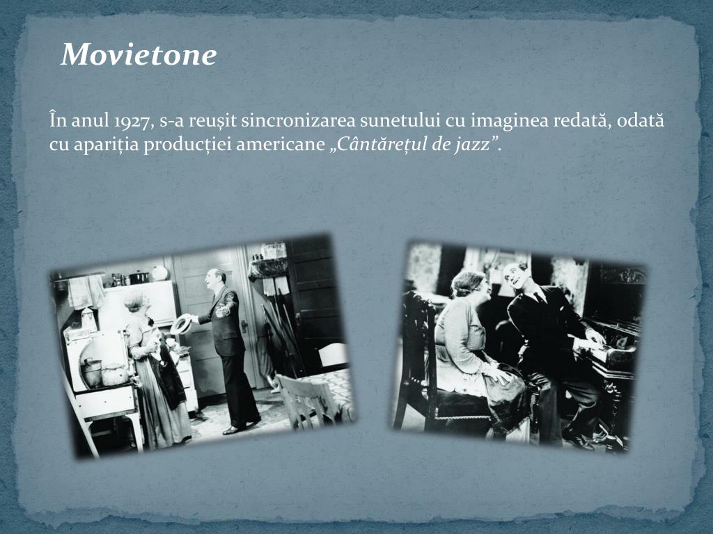 Movietone În anul 1927, s-a reușit sincronizarea sunetului cu imaginea redată, odată cu apariția producției americane „Cântărețul de jazz”.