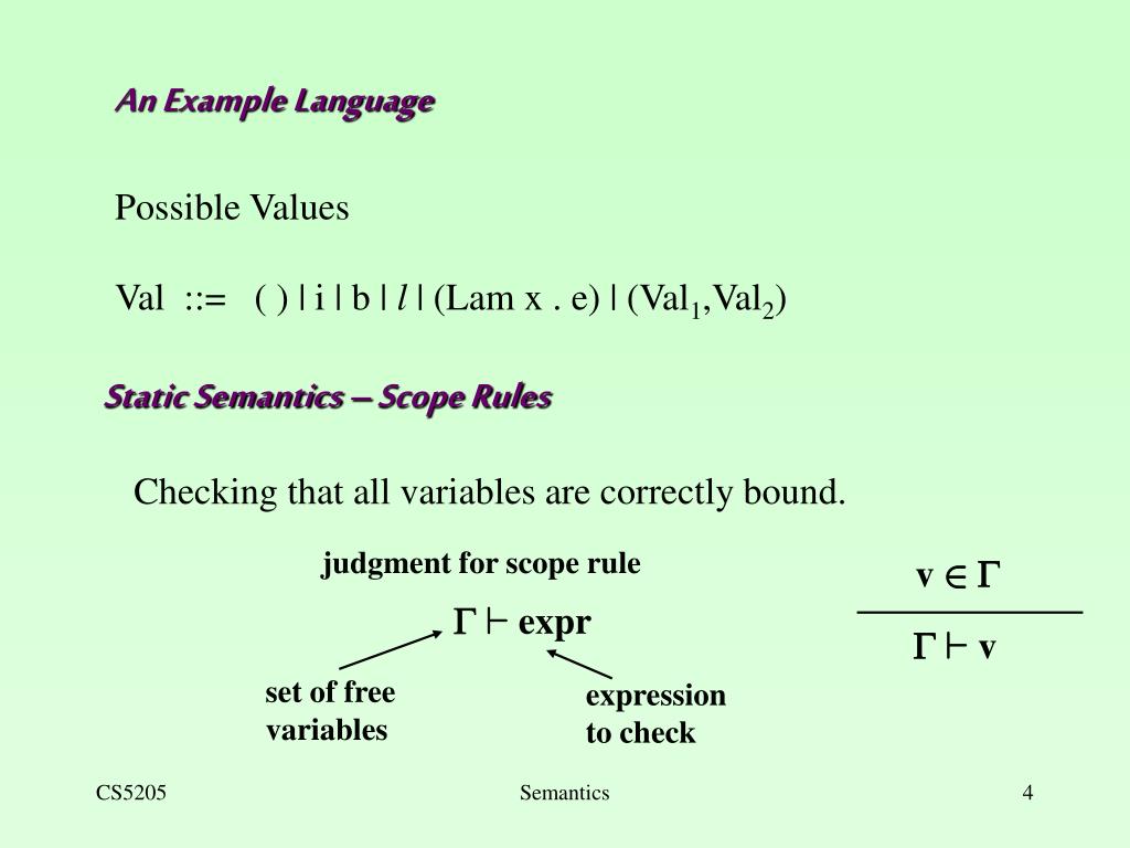 Static Semantics – Scope Rules Checking that all variables are correctly bound. judgment for scope rule v 2 ` expr ` v set of free variables expression to check An Example Language Possible Values Val ::= ( ) | i | b | l | (Lam x . e) | (Val1,Val2) Semantics