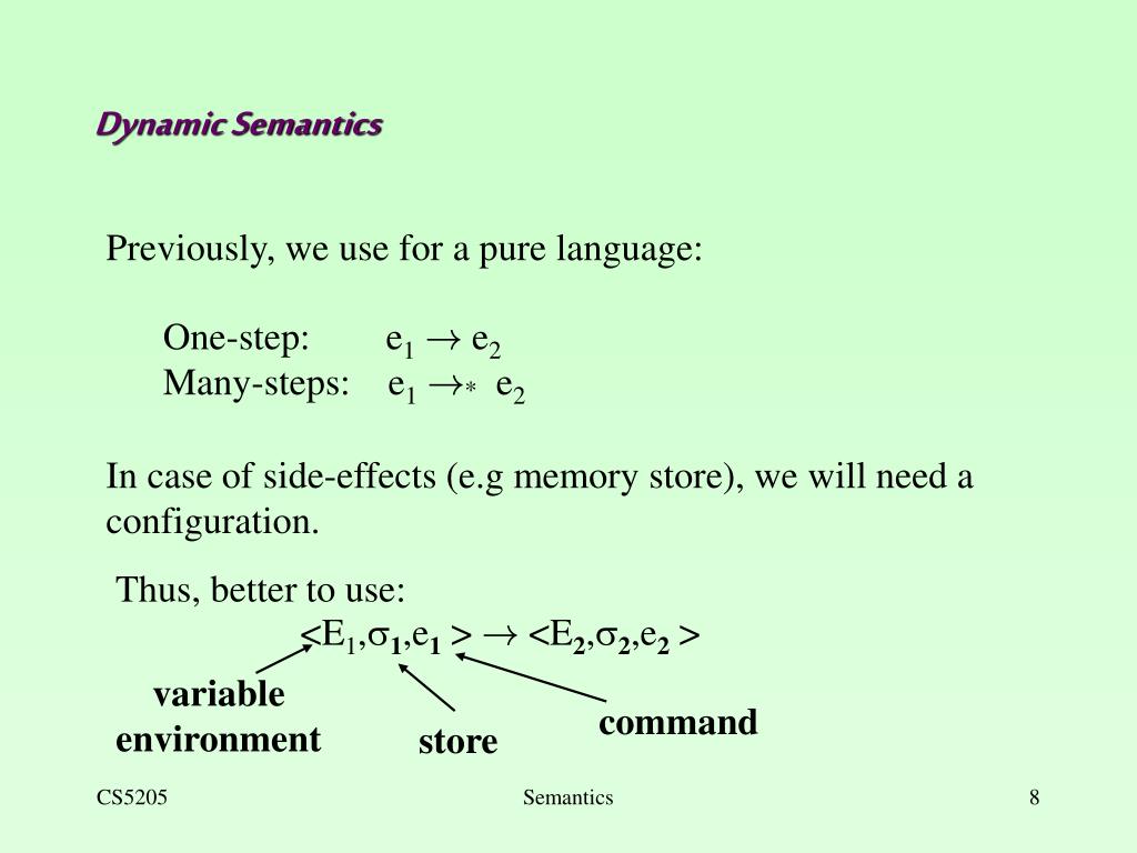 Thus, better to use: <E1,1,e1 > ! <E2,2,e2 > variable environment command store Dynamic Semantics Previously, we use for a pure language: One-step: e1! e2 Many-steps: e1!* e2 In case of side-effects (e.g memory store), we will need a configuration. Semantics