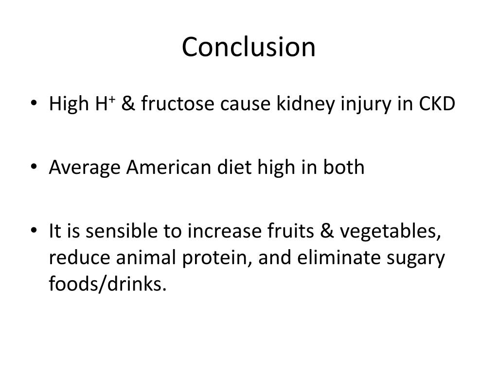 Conclusion • High H+ & fructose cause kidney injury in CKD • Average American diet high in both • It is sensible to increase fruits & vegetables, reduce animal protein, and eliminate sugary foods/drinks.