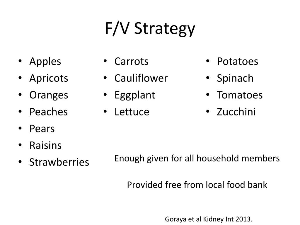 F/V Strategy • Apples • Apricots • Oranges • Peaches • Pears • Raisins • Strawberries • Carrots • Cauliflower • Eggplant • Lettuce • Potatoes • Spinach • Tomatoes • Zucchini Enough given for all household members Provided free from local food bank Goraya et al Kidney Int 2013.