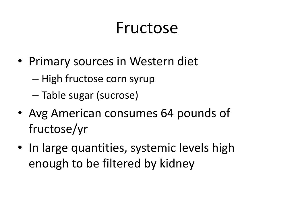 Fructose • Primary sources in Western diet • High fructose corn syrup • Table sugar (sucrose) • AvgAmerican consumes 64 pounds of fructose/yr • In large quantities, systemic levels high enough to be filtered by kidney