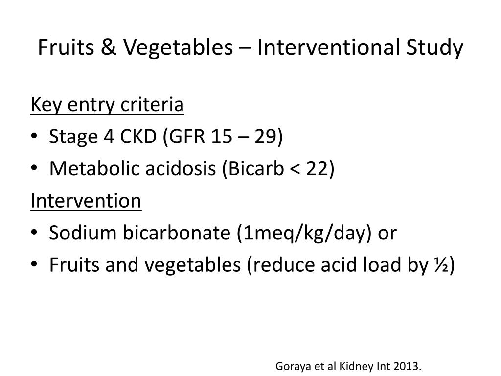 Fruits & Vegetables – Interventional Study Key entry criteria • Stage 4 CKD (GFR 15 – 29) • Metabolic acidosis (Bicarb < 22) Intervention • Sodium bicarbonate (1meq/kg/day) or • Fruits and vegetables (reduce acid load by ½) Goraya et al Kidney Int 2013.