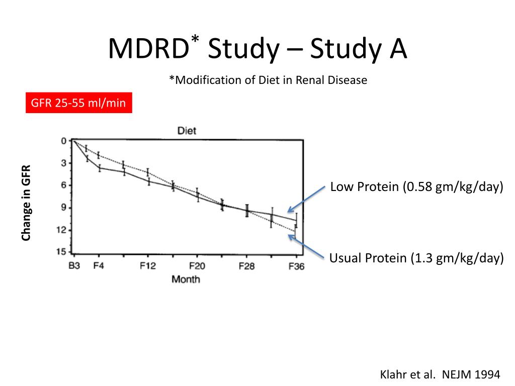 MDRD* Study – Study A *Modification of Diet in Renal Disease GFR 25-55 ml/min Low Protein (0.58 gm/kg/day) Change in GFR Usual Protein (1.3 gm/kg/day) Klahr et al. NEJM 1994