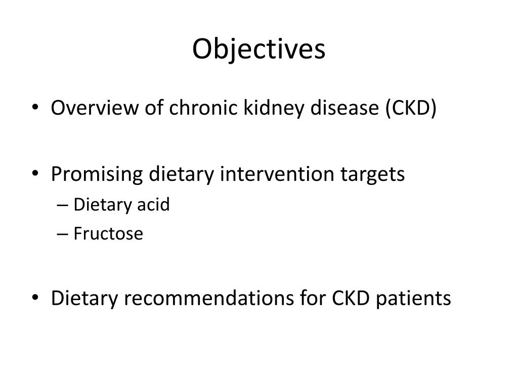 Objectives • Overview of chronic kidney disease (CKD) • Promising dietary intervention targets • Dietary acid • Fructose • Dietary recommendations for CKD patients