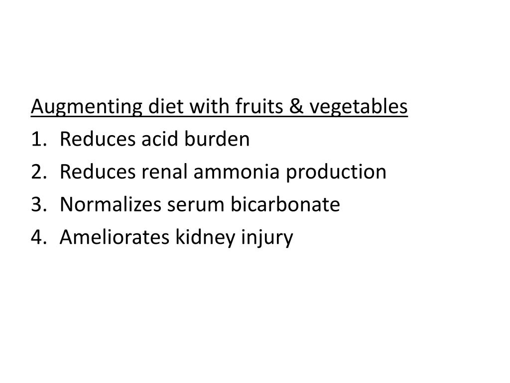 Augmenting diet with fruits & vegetables • Reduces acid burden • Reduces renal ammonia production • Normalizes serum bicarbonate • Ameliorates kidney injury