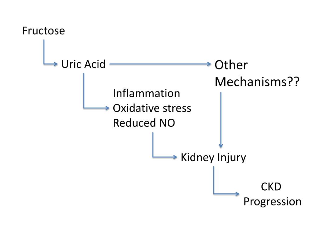 Fructose Other Mechanisms?? Uric Acid Inflammation Oxidative stress Reduced NO Kidney Injury CKD Progression