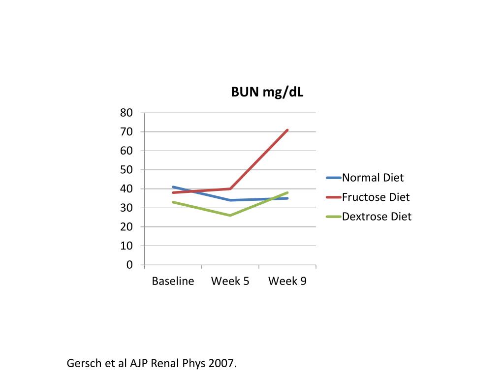 Low fructose diet – interventional study • 28 non-DM CKD stage 2 or 3 • Basal fructose intake (~60 gm/day) • 6 wk low fructose (~12 gm/day) • Designed to reduce by 80% • Return to basal diet for 6 wks (~53 gm/day) • No diff in caloric intake • Reduce consumption of sucrose-sweetened and artificially sweetened drinks & foods