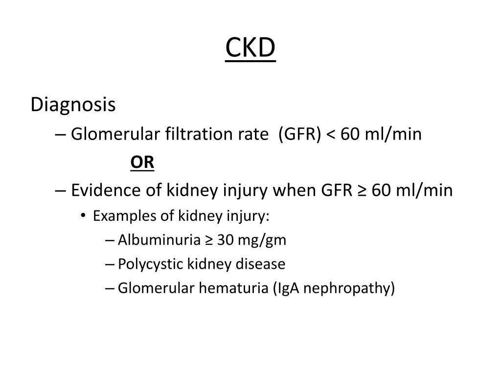 CKD Diagnosis • Glomerular filtration rate (GFR) < 60 ml/min OR • Evidence of kidney injury when GFR ≥ 60 ml/min • Examples of kidney injury: • Albuminuria ≥ 30 mg/gm • Polycystic kidney disease • Glomerular hematuria (IgA nephropathy)