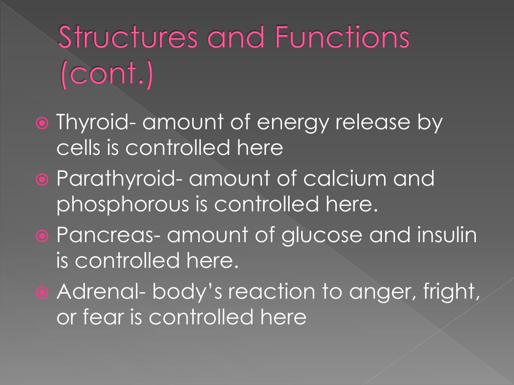 Structures and Functions (cont.) • Thyroid- amount of energy release by cells is controlled here • Parathyroid- amount of calcium and phosphorous is controlled here. • Pancreas- amount of glucose and insulin is controlled here. • Adrenal- body’s reaction to anger, fright, or fear is controlled here