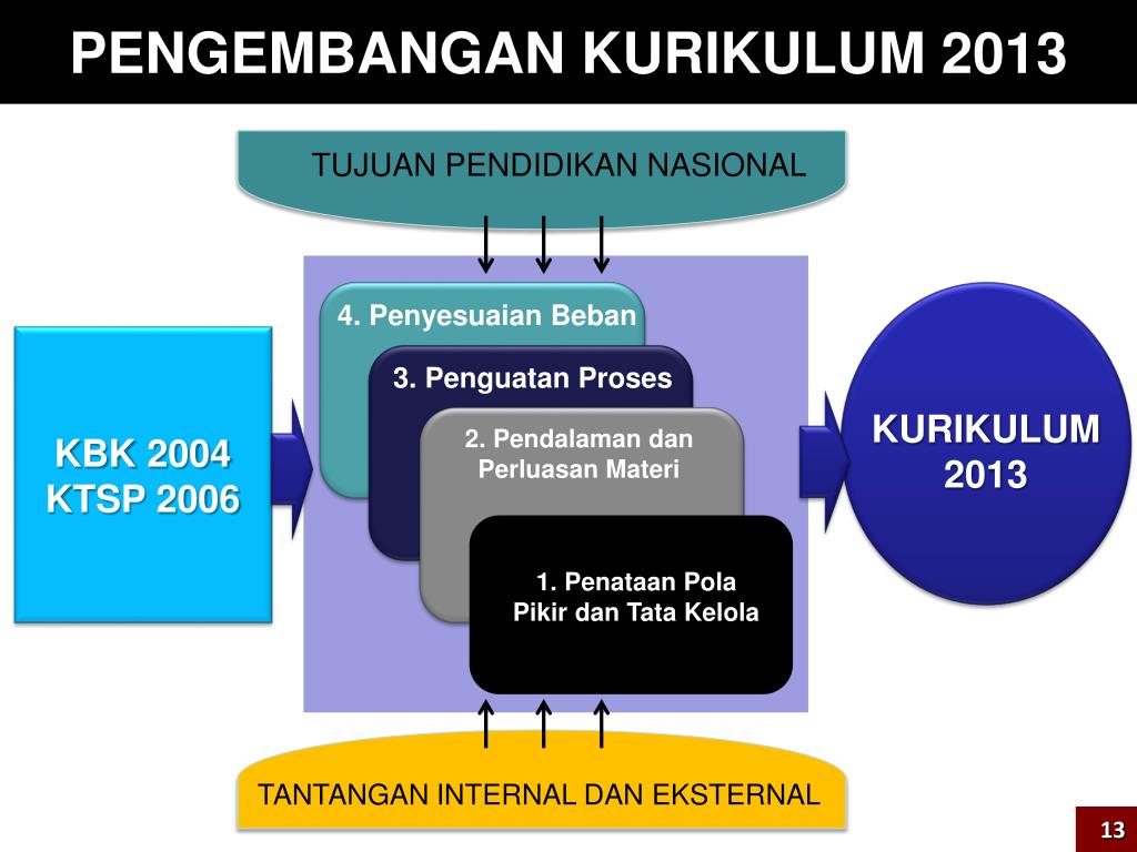 PENGEMBANGAN KURIKULUM 2013 TUJUAN PENDIDIKAN NASIONAL 4. Penyesuaian Beban KBK 2004 KTSP 2006 3. Penguatan Proses KURIKULUM 2013 2. Pendalaman dan Perluasan Materi 1. Penataan Pola Pikir dan Tata Kelola TANTANGAN INTERNAL DAN EKSTERNAL 13
