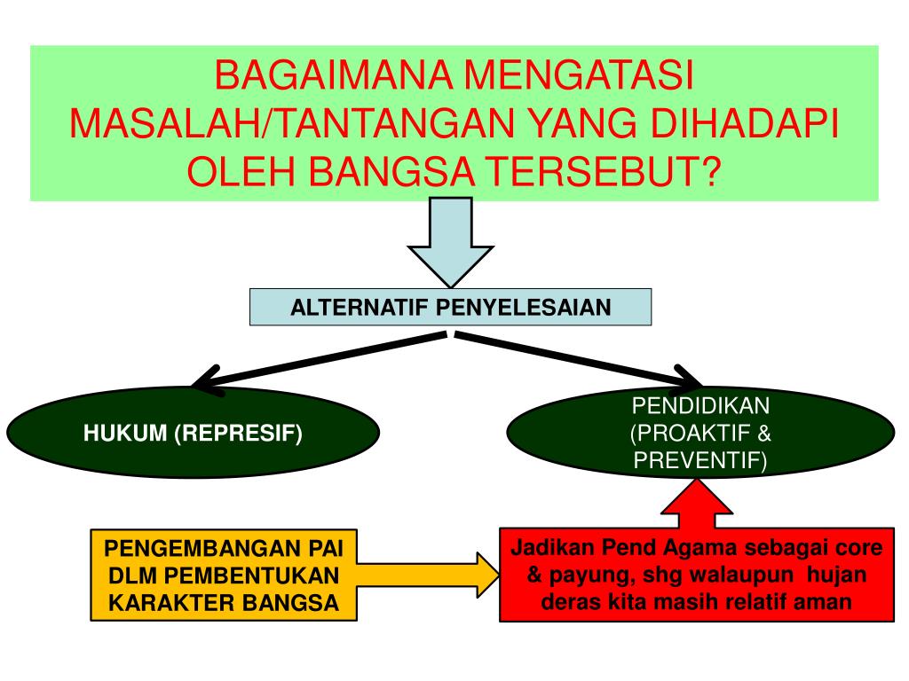 BAGAIMANA MENGATASI MASALAH/TANTANGAN YANG DIHADAPI OLEH BANGSA TERSEBUT? ALTERNATIF PENYELESAIAN HUKUM (REPRESIF) PENDIDIKAN (PROAKTIF & PREVENTIF) Jadikan Pend Agama sebagai core & payung, shg walaupun hujan deras kita masih relatif aman PENGEMBANGAN PAI DLM PEMBENTUKAN KARAKTER BANGSA