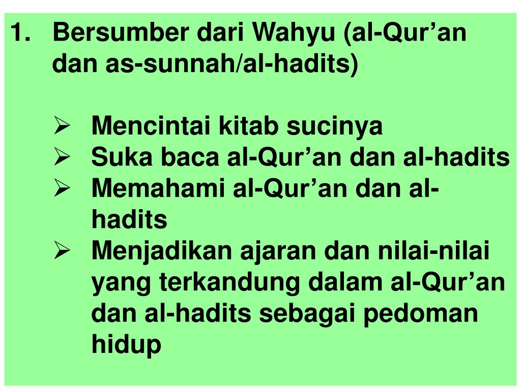 Bersumberdari Wahyu (al-Qur’an dan as-sunnah/al-hadits) • Mencintai kitabsucinya • Sukabaca al-Qur’an dan al-hadits • Memahami al-Qur’an dan al-hadits • Menjadikanajarandannilai-nilai yang terkandungdalam al-Qur’an dan al-haditssebagaipedomanhidup