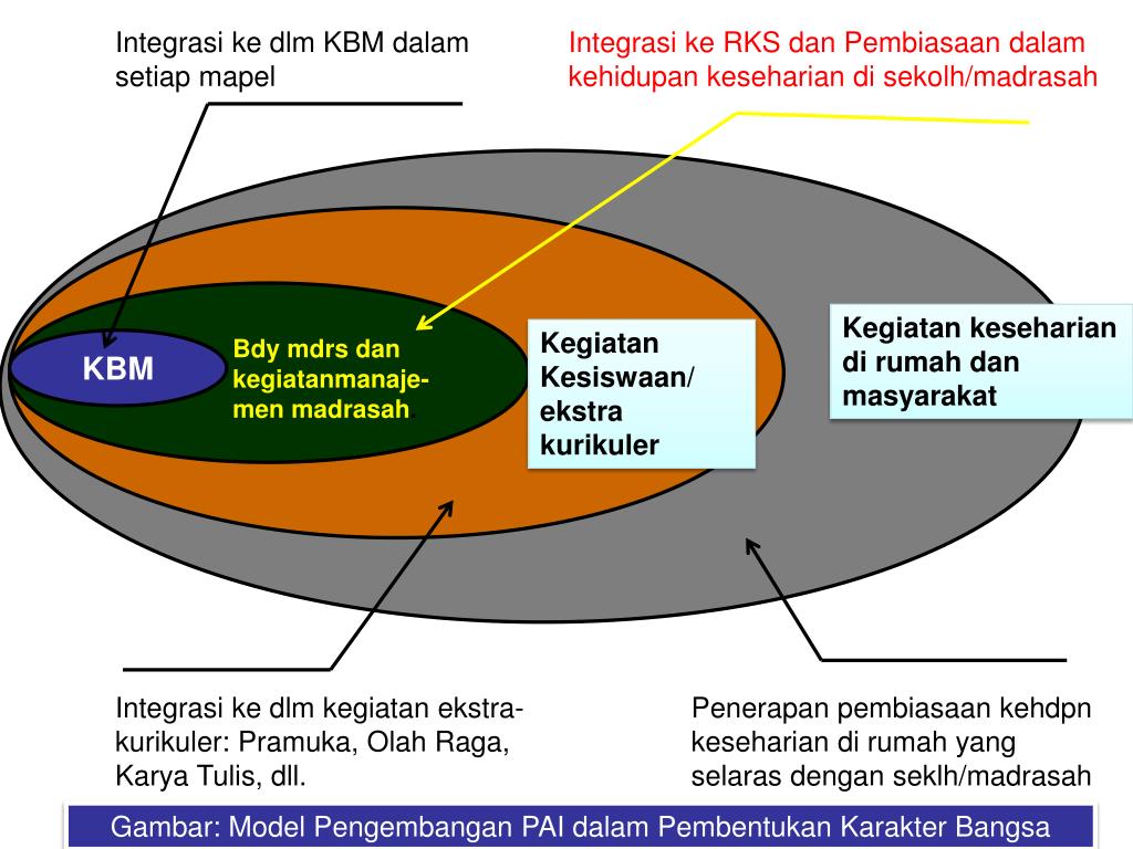 Integrasi ke dlm KBM dalam setiap mapel Integrasike RKS danPembiasaandalamkehidupankesehariandisekolh/madrasah Kegiatankesehariandirumahdanmasyarakat KegiatanKesiswaan/ ekstrakurikuler Bdymdrsdankegiatanmanaje-men madrasah. KBM Integrasikedlmkegiatanekstra-kurikuler: Pramuka, Olah Raga, KaryaTulis, dll. Penerapan pembiasaan kehdpn keseharian di rumah yang selaras dengan seklh/madrasah Gambar: Model Pengembangan PAI dalam Pembentukan Karakter Bangsa