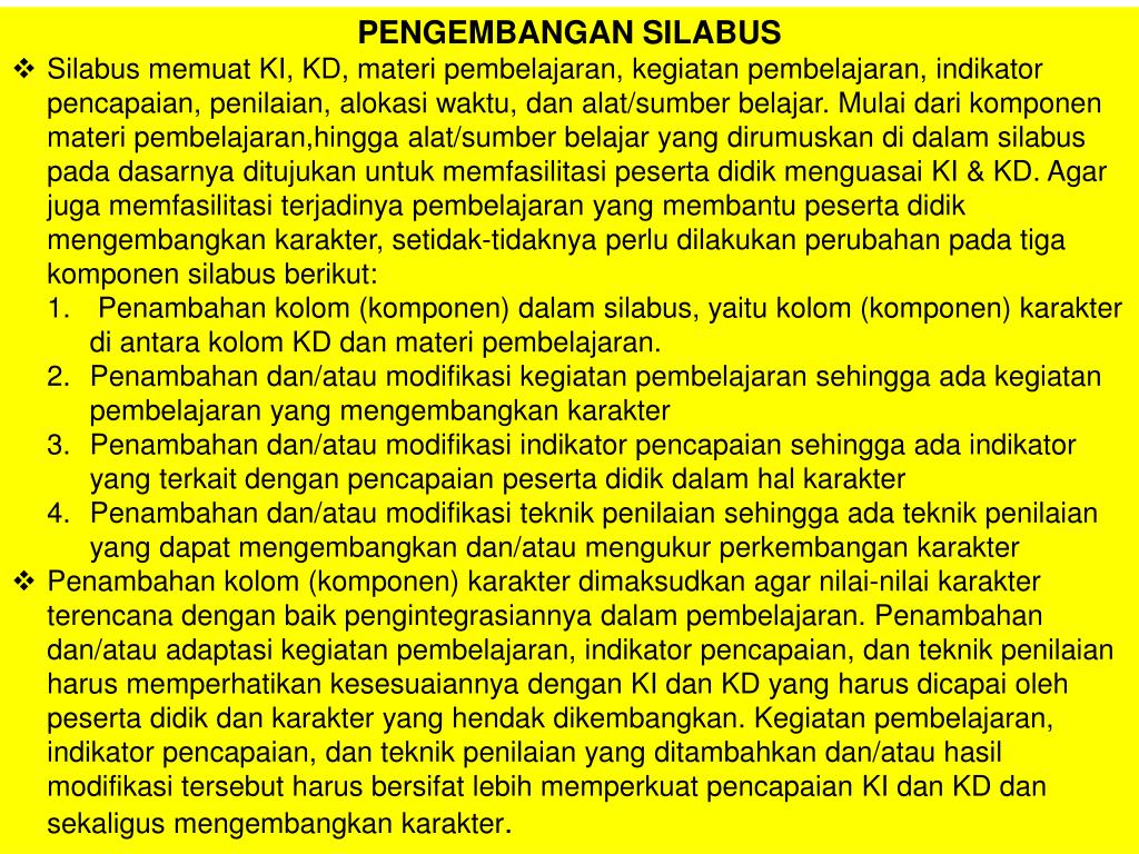 PENGEMBANGAN SILABUS • Silabus memuat KI, KD, materi pembelajaran, kegiatan pembelajaran, indikator pencapaian, penilaian, alokasi waktu, dan alat/sumber belajar. Mulai dari komponen materi pembelajaran,hinggaalat/sumber belajar yang dirumuskan di dalam silabus pada dasarnya ditujukan untuk memfasilitasi peserta didik menguasai KI & KD. Agar juga memfasilitasi terjadinya pembelajaran yang membantu peserta didik mengembangkan karakter, setidak-tidaknya perlu dilakukan perubahan pada tiga komponen silabus berikut: • Penambahan kolom (komponen) dalam silabus, yaitu kolom (komponen) karakter di antara kolom KD dan materi pembelajaran. • Penambahan dan/atau modifikasi kegiatan pembelajaran sehingga ada kegiatan pembelajaran yang mengembangkan karakter • Penambahan dan/atau modifikasi indikator pencapaian sehingga ada indikator yang terkait dengan pencapaian peserta didik dalam hal karakter • Penambahan dan/atau modifikasi teknik penilaian sehingga ada teknik penilaian yang dapat mengembangkan dan/atau mengukur perkembangan karakter • Penambahan kolom (komponen) karakter dimaksudkan agar nilai-nilai karakter terencana dengan baik pengintegrasiannya dalam pembelajaran. Penambahan dan/atau adaptasi kegiatan pembelajaran, indikator pencapaian, dan teknik penilaian harus memperhatikan kesesuaiannya dengan KI dan KD yang harus dicapai oleh peserta didik dan karakter yang hendak dikembangkan. Kegiatan pembelajaran, indikator pencapaian, dan teknik penilaian yang ditambahkan dan/atau hasil modifikasi tersebut harus bersifat lebih memperkuat pencapaian KI dan KD dan sekaligus mengembangkan karakter.