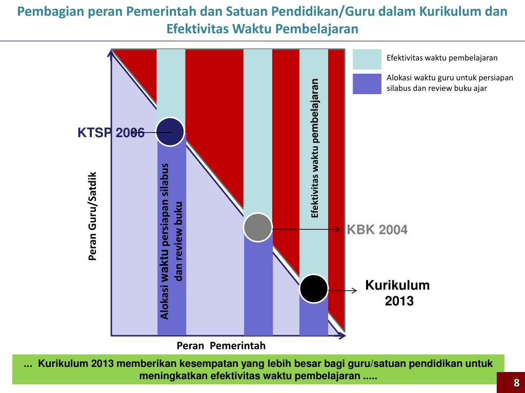 Pembagian peran Pemerintah dan Satuan Pendidikan/Guru dalam Kurikulum dan Efektivitas Waktu Pembelajaran Efektivitas waktu pembelajaran Alokasi waktu guru untuk persiapan silabus dan review buku ajar KTSP 2006 Efektivitaswaktupembelajaran Peran Guru/Satdik KBK 2004 Alokasiwaktupersiapansilabusdan review buku Kurikulum 2013 Peran Pemerintah ... Kurikulum 2013 memberikankesempatan yang lebihbesarbagi guru/satuanpendidikanuntuk meningkatkanefektivitaswaktupembelajaran ..... 8