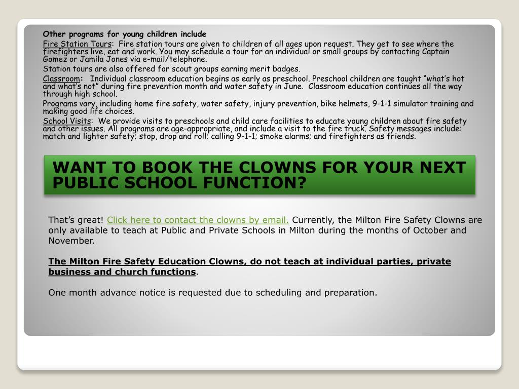 Other programs for young children include Fire Station Tours: Fire station tours are given to children of all ages upon request. They get to see where the firefighters live, eat and work. You may schedule a tour for an individual or small groups by contacting Captain Gomez or Jamila Jones via e-mail/telephone. Station tours are also offered for scout groups earning merit badges. Classroom: Individual classroom education begins as early as preschool. Preschool children are taught “what’s hot and what’s not” during fire prevention month and water safety in June. Classroom education continues all the way through high school. Programs vary, including home fire safety, water safety, injury prevention, bike helmets, 9-1-1 simulator training and making good life choices. School Visits: We provide visits to preschools and child care facilities to educate young children about fire safety and other issues. All programs are age-appropriate, and include a visit to the fire truck. Safety messages include: match and lighter safety; stop, drop and roll; calling 9-1-1; smoke alarms; and firefighters as friends. WANT TO BOOK THE CLOWNS FOR YOUR NEXT PUBLIC SCHOOL FUNCTION? That’s great! Click here to contact the clowns by email. Currently, the Milton Fire Safety Clowns are only available to teach at Public and Private Schools in Milton during the months of October and November. The Milton Fire Safety Education Clowns, do not teach at individual parties, private business and church functions. One month advance notice is requested due to scheduling and preparation.