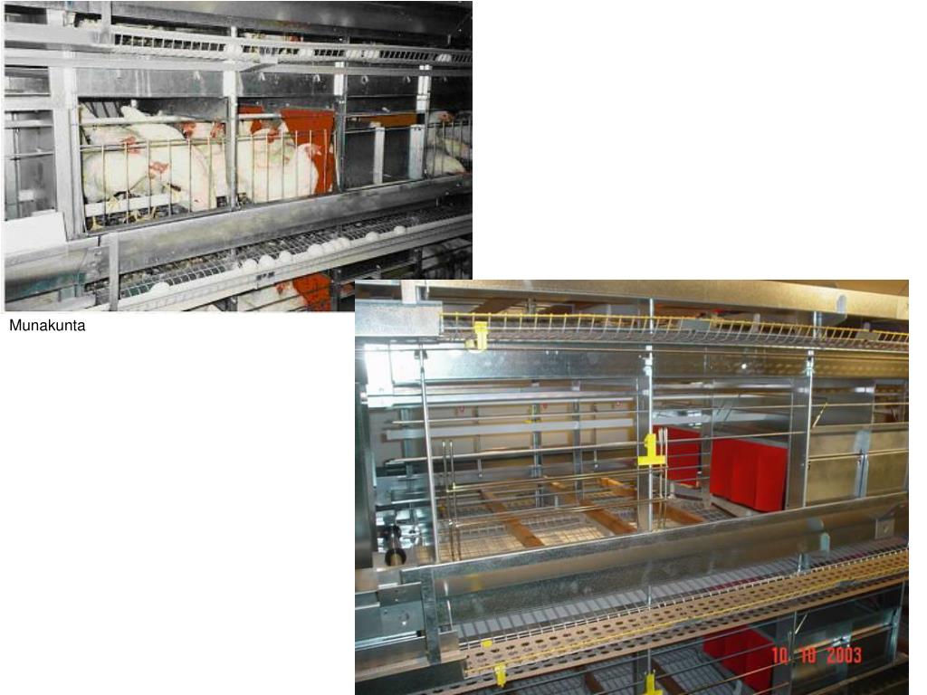 Perinteinen häkkikanala • kanoja yhdessä häkissä 3-7 kpl, kullekin kanalle tilaa väh. 550 cm² eli kanoja noin 18/m² • perinteisten häkkien asennuskielto v. 2005 alkaen • eivät sallittuja v. 2012 alkaen Neuvoston direktiivi 1999/74/EY munivien kanojen suojelun vähimmäisvaatimuksista; MMMas.10/EEO/2000, muutos 10/EEO/2002)