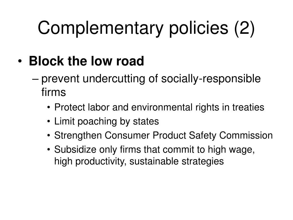 Complementary policies (2) • Block the low road • prevent undercutting of socially-responsible firms • Protect labor and environmental rights in treaties • Limit poaching by states • Strengthen Consumer Product Safety Commission • Subsidize only firms that commit to high wage, high productivity, sustainable strategies