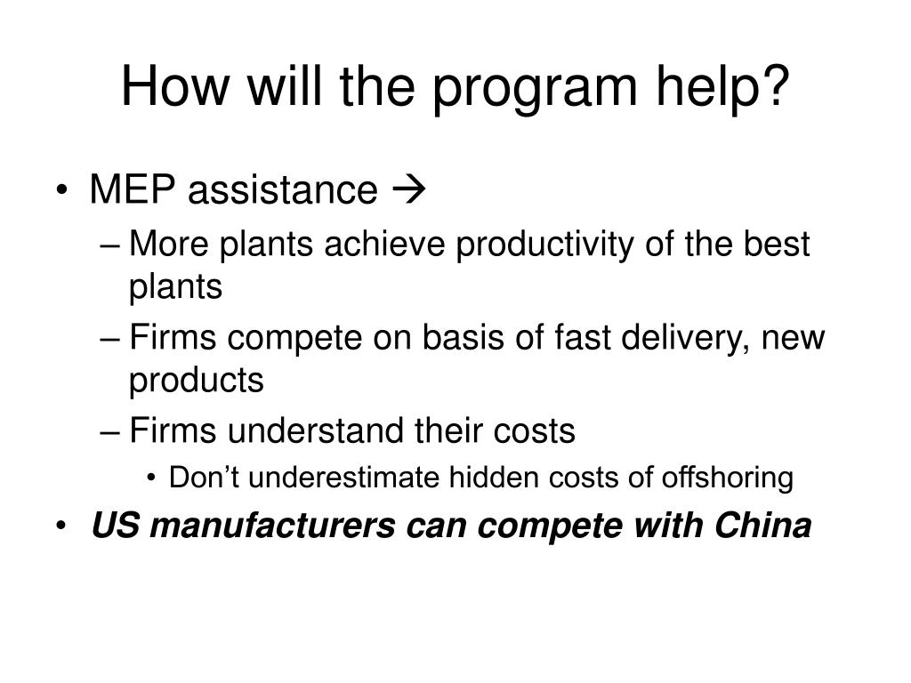 How will the program help? • MEP assistance • More plants achieve productivity of the best plants • Firms compete on basis of fast delivery, new products • Firms understand their costs • Don’t underestimate hidden costs of offshoring • US manufacturers can compete with China